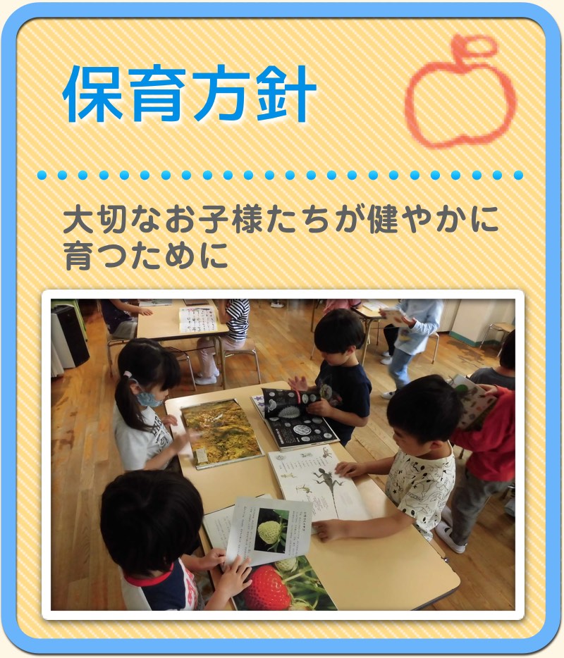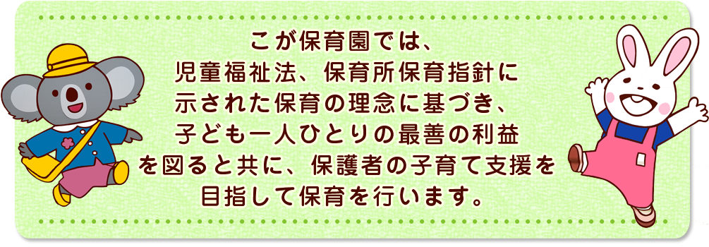 こが保育園では、「心の保育」を理念とし、人間形成の土台となる乳幼児期の 心の成長と身体の成長を保育の基本としています。
